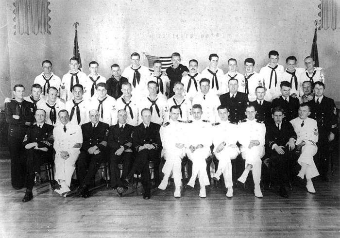 Front Row L-R: M.D Auglin TMC, unknown, “Pappy” Kirsch EMC, Theodore Yost MMC, Ensign A.H. Murray, Lieutenant Commander J.C. Wylie executive officer, Lieutenant Commander William M. Cole commanding officer, Ltjg. Hughes engineering officer, unknown, Ensign P.B. McLean assistant engineering officer, C.N. Martin MMC.