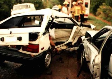 A hydroplane crash on a wet two lane road. A passenger in the white car was killed.
