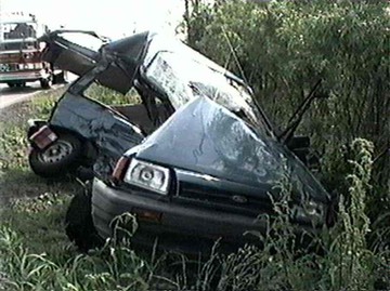 Two teens were in this car which was traveling on a two-lane road after a rainstorm. Their vehicle hydroplaned and slid broadside into opposing traffic. Both teens were killed and, the family in the other car received minor injuries.