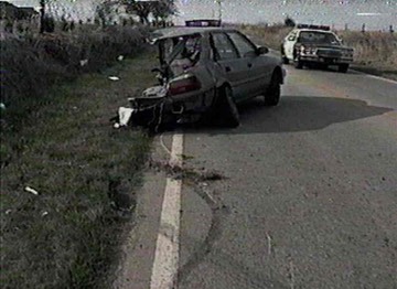 This compact vehicle driven by a young driver drifted off the edge of the roadway, and when he overcorrected and crossed the center line, he was struck by a van that peeled off the rear of his vehicle causing the small car to spin violently. The driver was wearing his seat belt, and since the spinning motion pinned him to the back of his seat, he came away with only superficial injuries. Watch video of this crash on YouTube by clicking here.